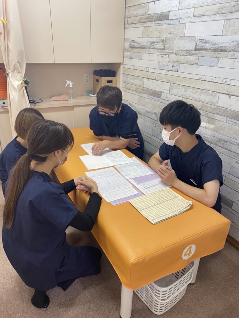 みなさんこんにちは!! 今回朝のミーティングの様子です!! うちの院は朝晩必ずミーティングを行います。 患者さんがどんな症状か変化があったかなどを、必ずみんなで情報交換し共有しています。 そして今日の目標を発表し、士気を高めて治療に入ります!!